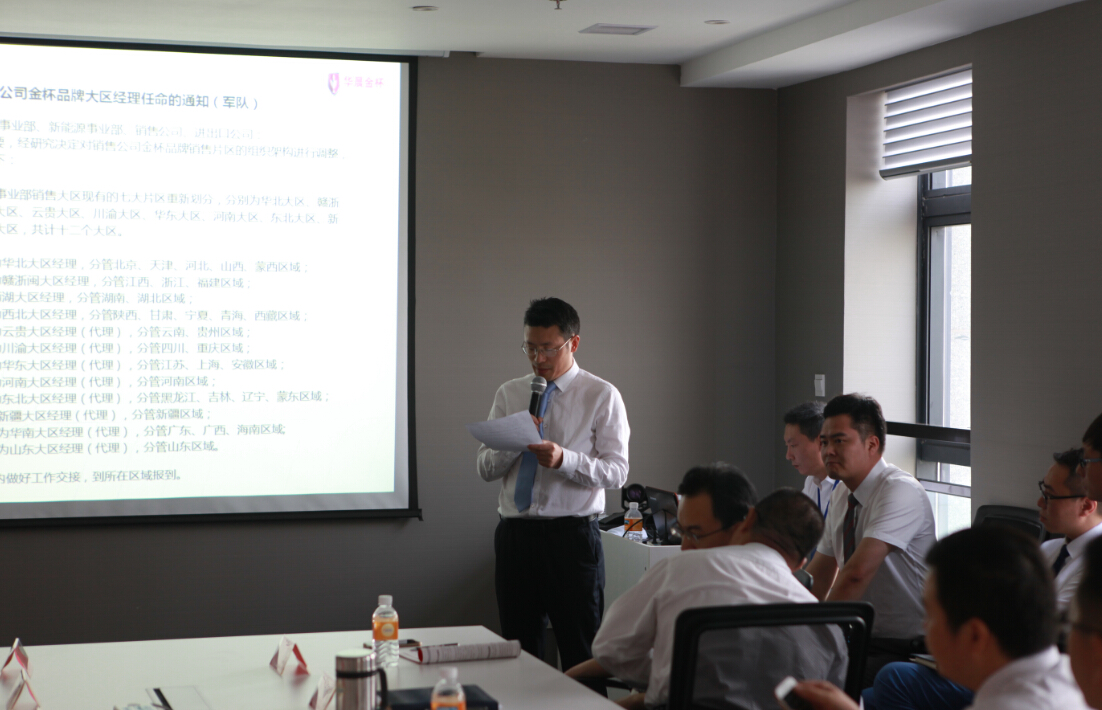 会议开始,汽车销售公司副总经理周江文宣布了金杯品牌新晋12名大区经理任命名单;12位新晋大区经理其中10位是通过公开竞聘产生,另外2名大区经理通过社会招聘加入销售团队。