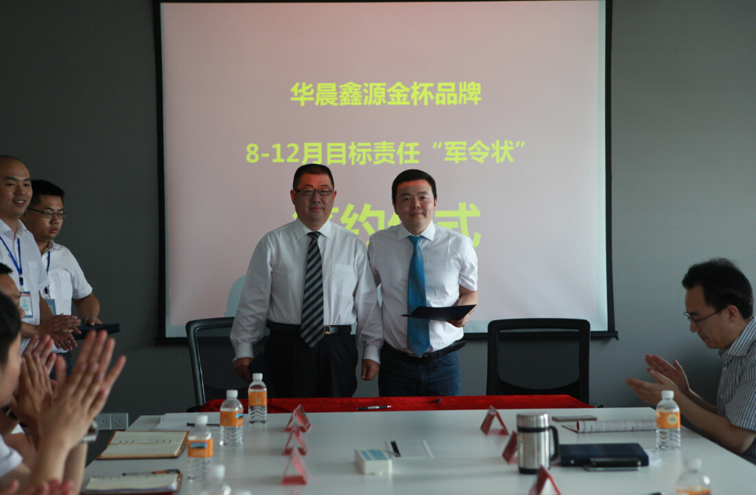 接下来,在震撼激扬的背景音乐下,金杯事业部营销总监蒋波与控股副总裁兼汽车销售公司总经理张洪岩率先签订“8-12月目标责任书”,立下“军令状”。其余12名新晋大区经理分别与金杯事业部营销总监蒋波立下“军令状”。