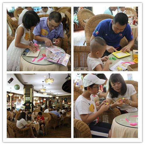 参观结束后,家庭团来到咖啡厅,公司领导致欢迎词并对企业情况进行简单的介绍。随后,含谷基地的家庭开始进行互动交流。该环节的内容是以家庭为单位进行相框DIY制作,旨在通过手工活动的形式,增进家庭的亲情互动。整个制作过程中,各位小朋友在家长的帮助下,专心致志地、聚精会神地捏着手中的橡皮泥,一家人齐心协力,相互帮助,争取最快最好地完成相框的制作。