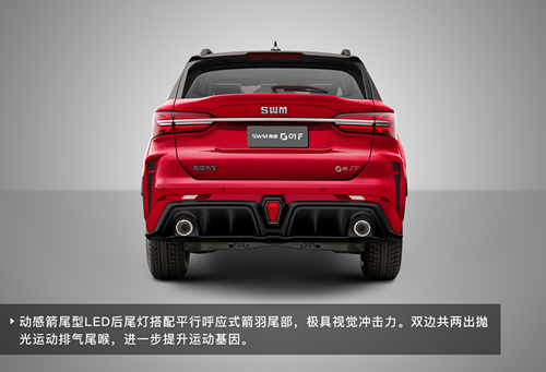 动于型,精于内。SWM斯威G01 F版采用黑色密集型翼展式运动前格栅,点缀以“F”形运动装饰和标配大包围及尾翼设计,带来强劲视觉冲击力。大胆双色车身、黑色车顶搭配动感十足,双边共两出抛光运动排气尾喉等运动套件吸引眼球,兼备原有“骑士之魂”设计元素,营造出轿跑级SUV的运动氛围,将青年人的张扬个性充分展现。