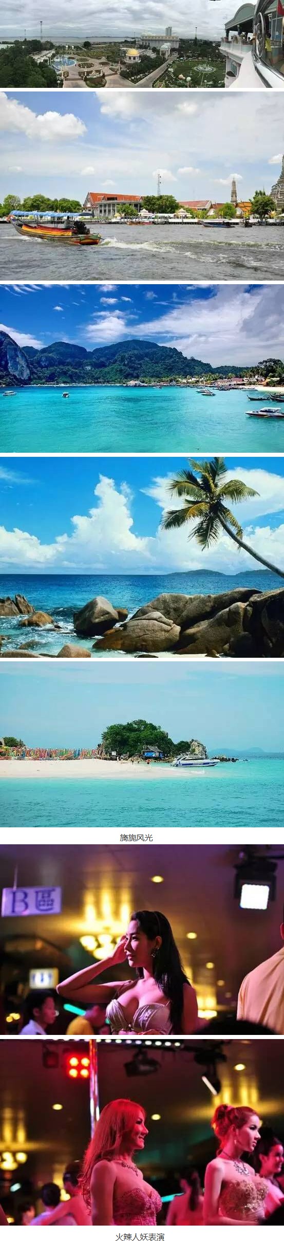 按照预定行程,8月25日游览充满暹罗建筑风格的大皇宫、玉佛寺、安南国会殿堂、长尾船游湄南河、以及充满异国风情的人妖表演;8月26日一同游览了三大奇观、乡村俱乐部、杜拉拉水上市场、金三角风情园、太平洋观景台等景点;8月27日、28日享受的是风光旖旎的金沙岛、珊瑚岛等著名景点。