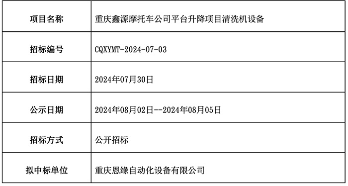 重庆五月天伊人久久久久摩托车公司平台升级项目清洗机设备已完成招标流程,现公示中标结果如下:
